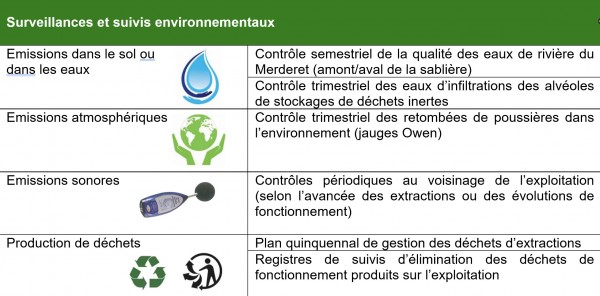 Le fonctionnement de la sablière du Haut-Pitois et des différentes activités qui y sont associées nécessite la mise en œuvre de plusieurs moyens de suivis et de surveillance des impacts environnementaux susceptibles d’être occasionnés ; en particulier :